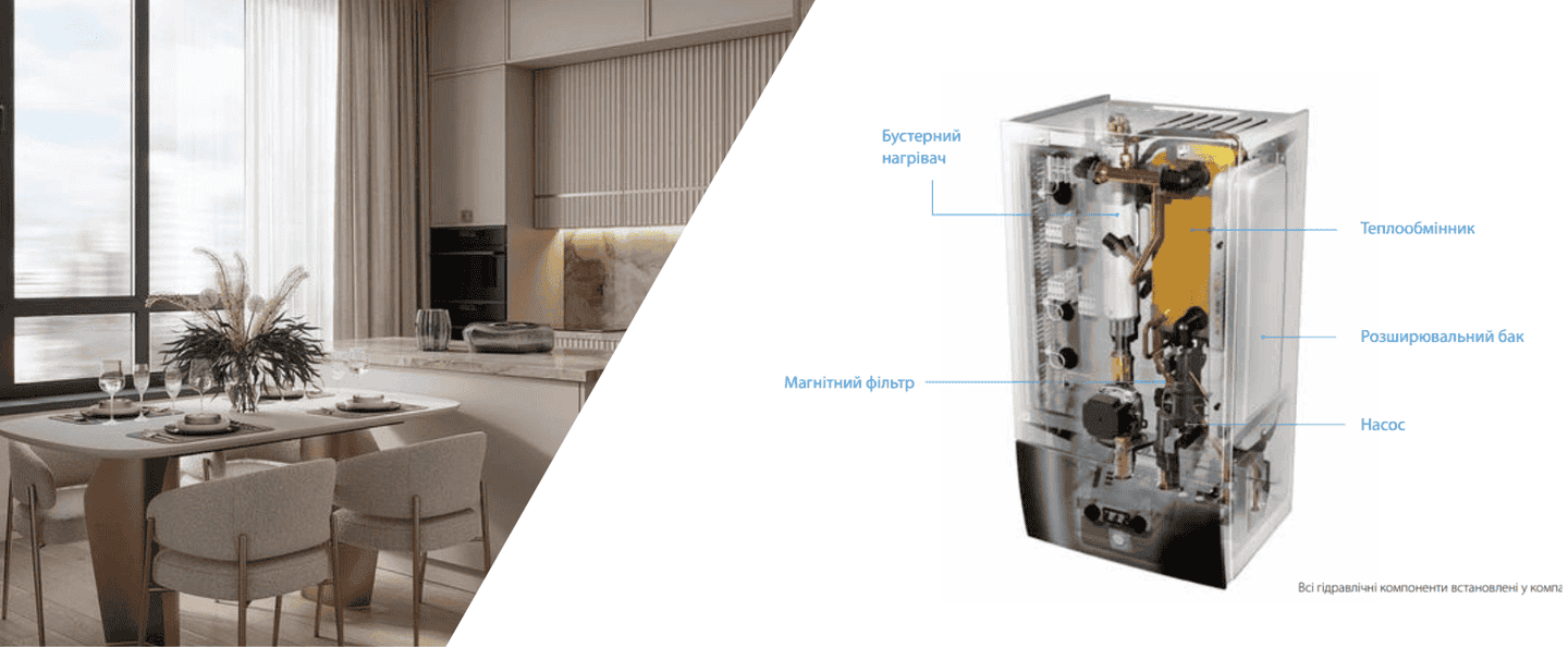 Адаптивна автоматика: Вбудована погодозалежна автоматика знижує енерговитрати і забезпечує точне регулювання температури відповідно до погодних умов.