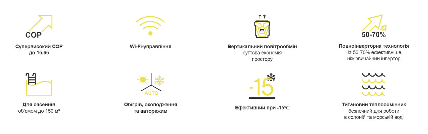 Технологія Full Inverter забезпечує адаптивну роботу компресора, вентилятора та електроніки, що дозволяє насосу працювати лише на необхідній потужності без перевитрати енергії. У середньому COP становить 6,14–15,65, що означає: на кожен кіловат спожитої електроенергії насос виробляє до 15,65 кВт теплової енергії. Це значно знижує експлуатаційні витрати та робить пристрій одним з найекономічніших у своєму класі.