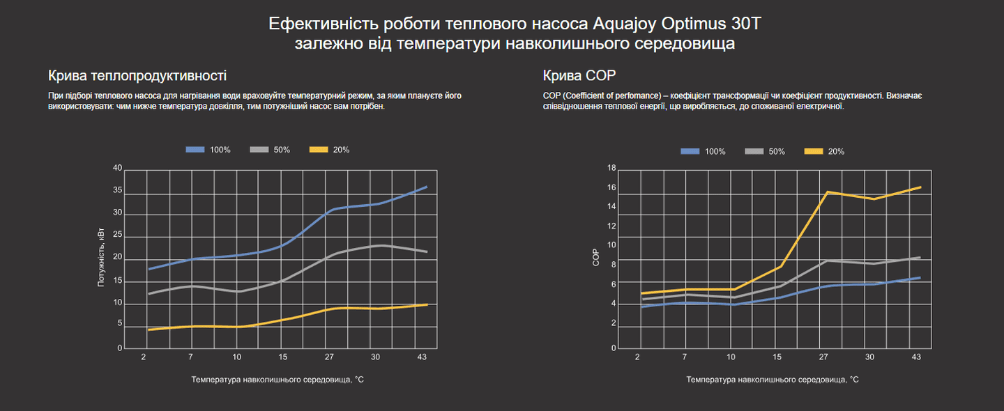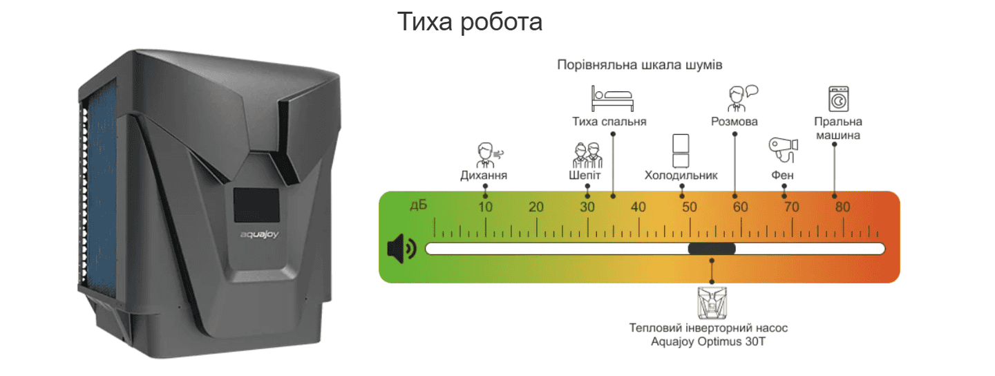 Aquajoy Optimus 30T — це потужне й інтелектуальне рішення для нагріву та охолодження води в басейнах об’ємом від 80 до 150 м³. Повний інверторний компресор у поєднанні з оптимізованим вентилятором забезпечує високий коефіцієнт продуктивності (COP) — у 1,5–2 рази вищий, ніж у стандартних моделей, зберігаючи при цьому до 15 кВт теплової потужності, що гарантує максимальну енергоефективність і помітну економію енергії.