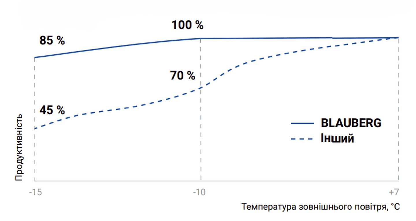 Одна з важливих характеристик теплового насосу Blauberg моноблок – це здатність підтримувати високу продуктивність навіть за низьких температур навколишнього середовища. Завдяки компресору з високим ступенем стиснення, збільшеному теплообміннику та високоточному керуванню системою, тепловий насос здатен забезпечувати високий рівень тепла навіть при температурах -10 °C і -15 °C. Це особливо важливо для холодних регіонів, де традиційні системи опалення можуть бути неефективними або потребувати додаткових джерел енергії.