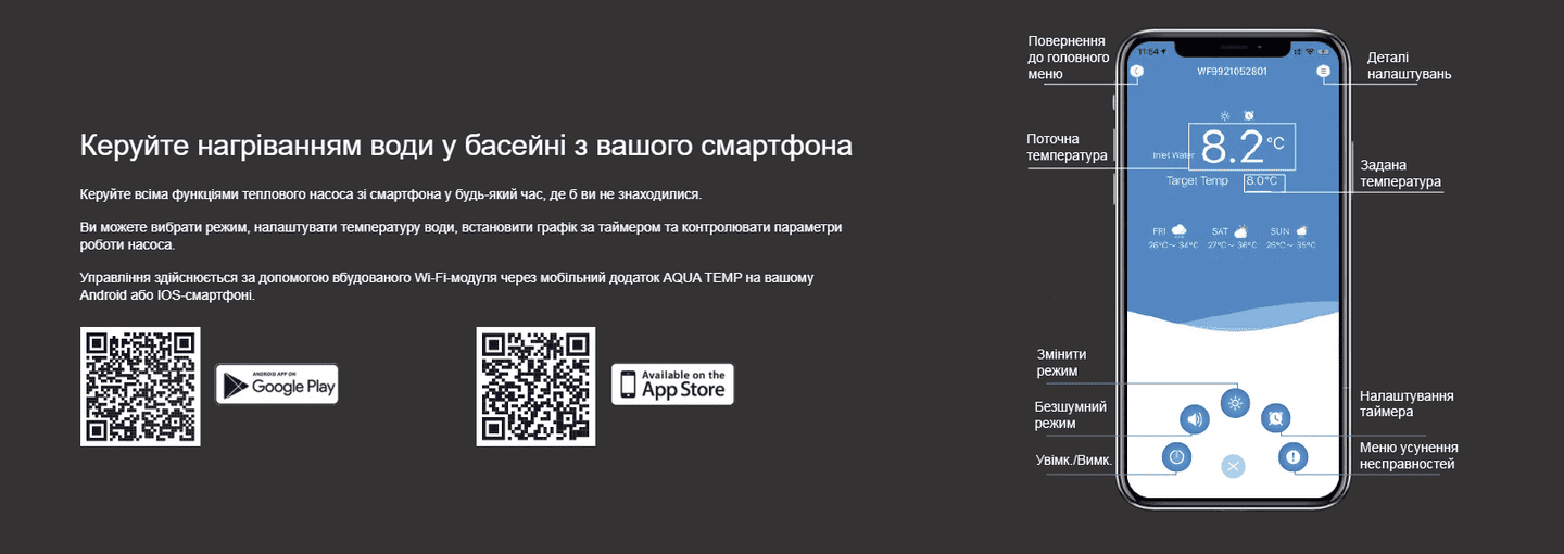 Вбудований Wi‑Fi модуль і мобільний додаток AQUA TEMP (Android/iOS) дають змогу дистанційно керувати всіма параметрами роботи насоса — від задання температури й таймера до вибору режиму нагріву чи охолодження та моніторингу в реальному часі з будь‑якої точки світу.