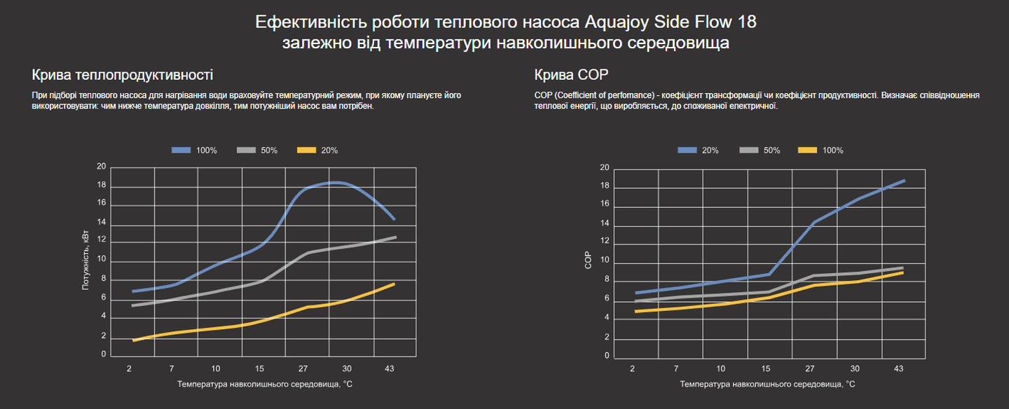 Максимальна теплова потужність пристрою становить 18 кВт, а коефіцієнт продуктивності (COP) сягає до 16,5 — це один із найвищих показників у своєму класі. Насос працює у діапазоні температур повітря від -10 до +43°C, забезпечуючи підігрів води від +9 до +40°C, а також охолодження в межах +8 до +28°C. Це робить Aquajoy Side Flow 18 придатним для використання цілий рік.