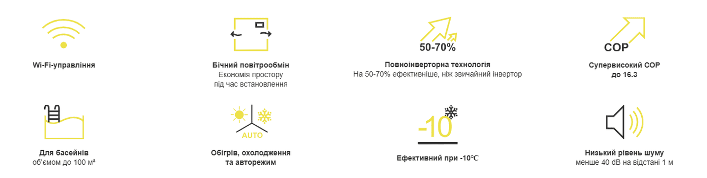 Завдяки боковому відведенню повітря, агрегат працює набагато тихіше, ніж стандартні моделі, що викидають повітря вертикально або назад. Це знижує рівень шуму на 4–6 дБ і мінімізує дискомфорт, що особливо важливо при встановленні поруч з басейном чи житловим будинком.
