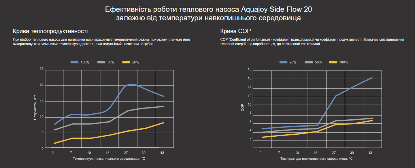 Максимальна теплова потужність пристрою становить 20 кВт, а коефіцієнт продуктивності (COP) сягає до 16,3 — це один із найвищих показників у своєму класі. Насос працює у діапазоні температур повітря від -10 до +43°C, забезпечуючи підігрів води від +9 до +40°C, а також охолодження в межах +8 до +28°C. Це робить Aquajoy Side Flow 20 придатним для використання цілий рік.