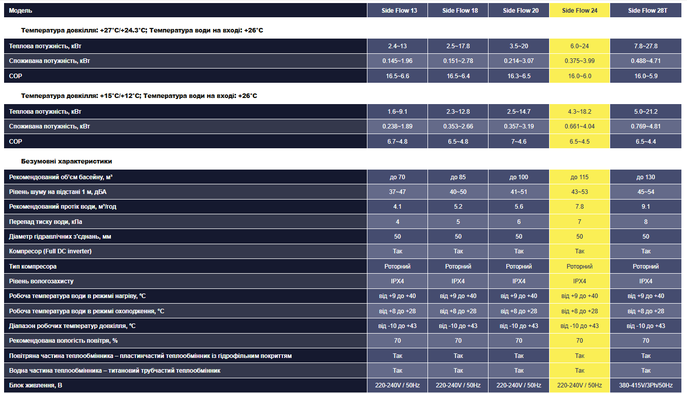 Тепловий насос для басейну Aquajoy Side Flow 24 (24 кВт), інверторний, об’єм басейну до 115 м³, -10°С/+43°С, 220В