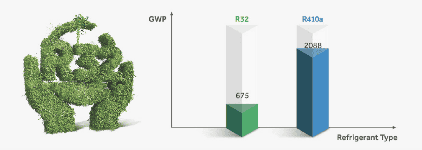Пристрій працює на екологічному холодоагенті R32, який має у три рази нижчий коефіцієнт потенціалу глобального потепління (GWP) у порівнянні з R410A. Це знижує вплив на навколишнє середовище та сприяє зменшенню викидів CO2.