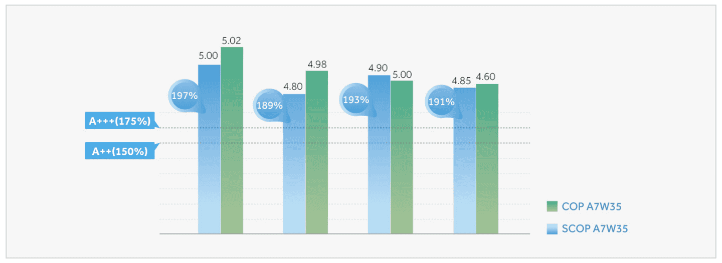 Тепловий насос Haier Super Aqua забезпечує найвищий рівень енергоефективності, досягаючи класу A+++ при температурі води 35°C та A++ при температурі води 55°C. Це дозволяє значно зменшити витрати на електроенергію та експлуатаційні витрати в порівнянні з традиційними системами опалення.