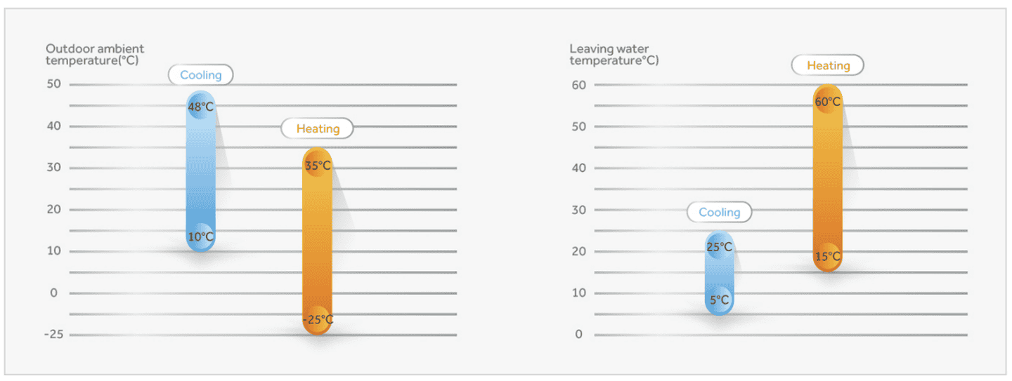 Тепловий насос функціонує навіть при екстремально низьких температурах до -25°C, забезпечуючи стабільне опалення навіть у холодних регіонах.