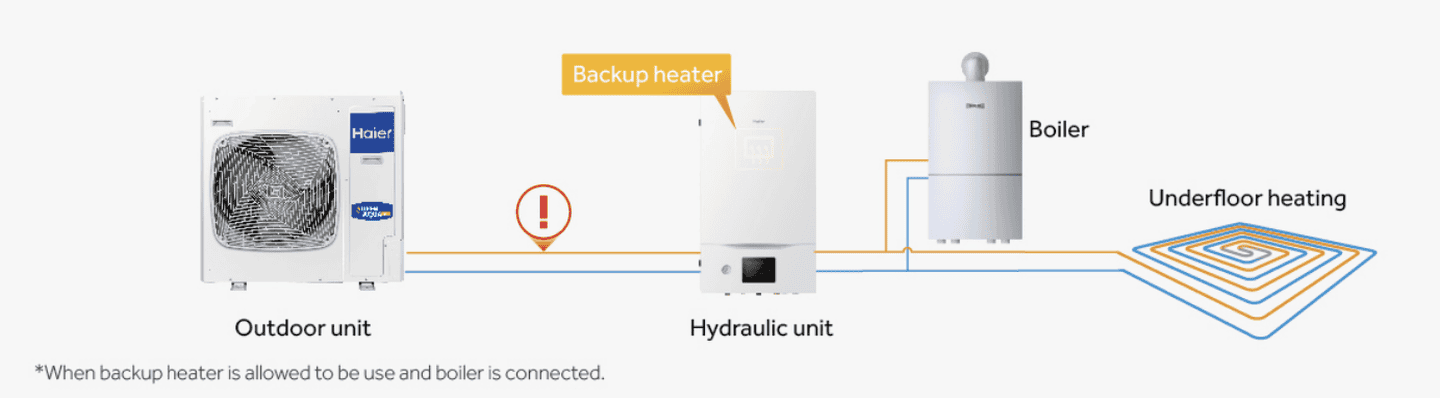 При виникненні несправностей Haier Super Aqua може працювати у зв’язці з котлом. У разі непередбаченої поломки пристрій автоматично перемикається на роботу котла або резервного нагрівача, забезпечуючи безперервне опалення приміщення.