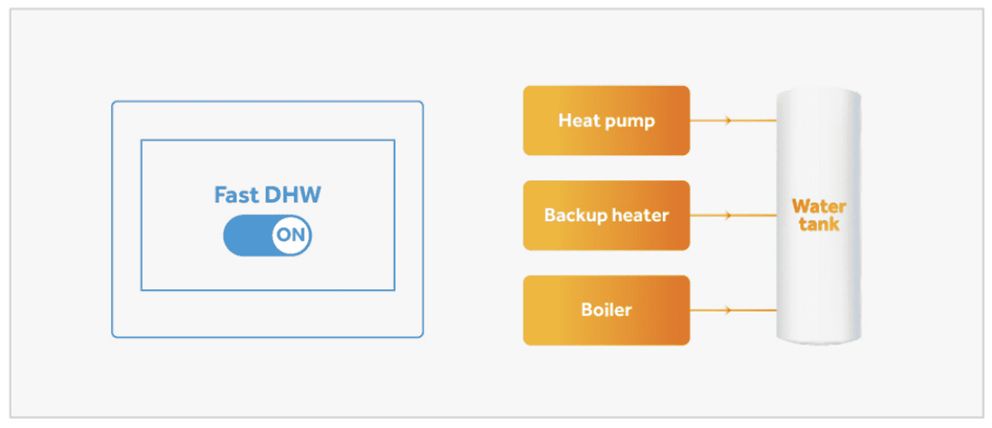 При активації режиму Fast DHW тепловий насос активує резервний нагрівач або додаткове джерело тепла, щоб якнайшвидше досягти заданої температури гарячої води, незалежно від зовнішніх умов та часу роботи компресора.