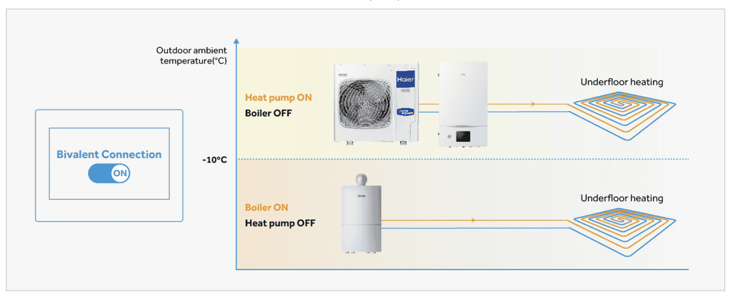 Система може працювати спільно з котлом, а функція “bivalent connection” дозволяє тепловому насосу контролювати всю систему, автоматично вмикаючи котел у разі потреби.