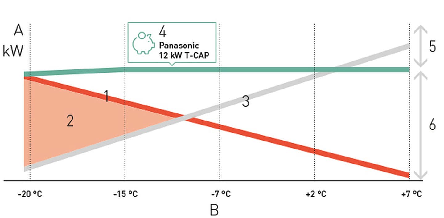 На відміну від багатьох інших систем, Aquarea T-CAP не потребує завищеної номінальної потужності для стабільної роботи при низьких температурах. Навіть при -20 °C система стабільно працює без допомоги додаткових електронагрівачів.