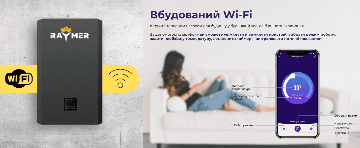 Вбудований модуль Wi-Fi дає змогу керувати роботою теплового насосу на відстані. Де б ви не були, ви можете увімкнути/вимкнути тепловий насос, а також відслідковувати його показники маючи доступ до інтернету.