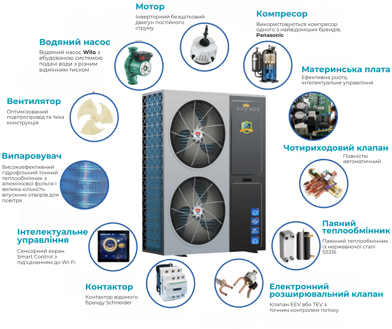 Завдяки застосуванню технологій Panasonic, тепловий насос Raymer відрізняється надійністю, стабільністю та преміальним рівнем енергоефективності, що робить його ідеальним вибором для сучасних енергонезалежних будинків.