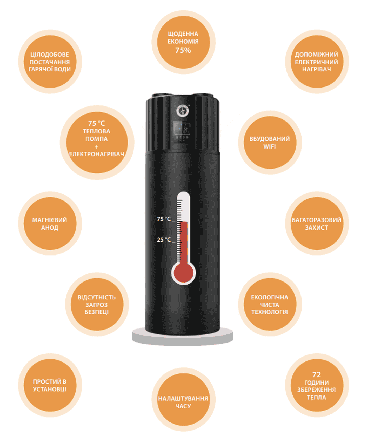 У разі, якщо теплового насоса недостатньо для досягнення заданої температури (наприклад, при низькій температурі навколишнього середовища), автоматично активується електронагрівач. Це дозволяє забезпечити нагрів води до температури до 75°C навіть у складних умовах.