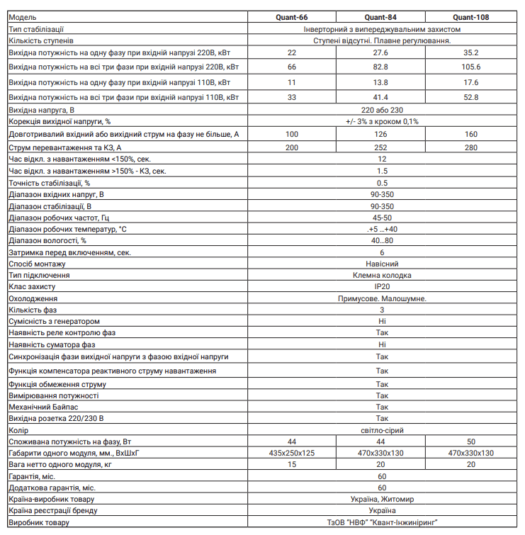 Quant-84 – трифазний стабілізатор з можливістю однофазної роботи та наявним суматором потужності фаз (з вбудованим блоком контролю фаз). Quant-84 — це шість однофазних інверторних стабілізаторів напруги Quant-14, які працюють з суматором потужності. Головна відмінність Quant-84 від звичайного трифазного стабілізатора без синхронізатора фаз в тому, що він захищає трифазне обладнання при несправній трифазній мережі.