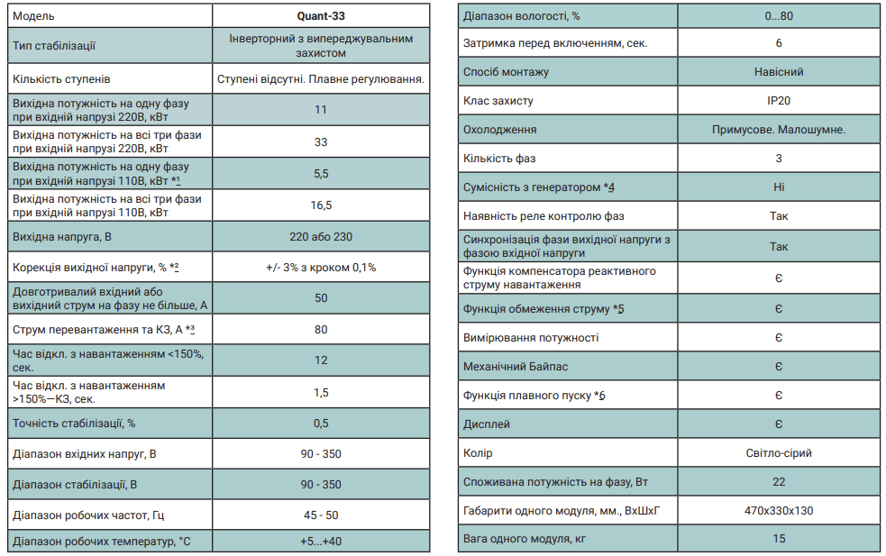 Трифазний стабілізатор напруги Quant-33 – це три однофазні інверторні стабілізатори напруги Quant-11, які працюють у парі з блоком контролю фаз. Головна відмінність трифазних стабілізаторів напруги Quant від звичайного трифазного стабілізатора із синхронізатором у тому, що він не блокує роботу однофазних споживачів навіть якщо з якихось причин відсутні дві фази.