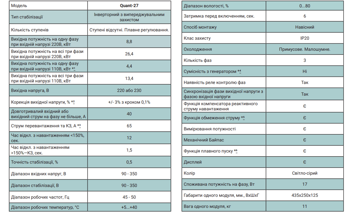 - Більшість небезпечних ситуацій вирішується без відключення стабілізатора, подаючи на навантаження чисту, відфільтровану напругу на фазу 220В (230В), 50Гц, і споживач не помітить проблем, які могли б становити небезпеку для його електротехніки.