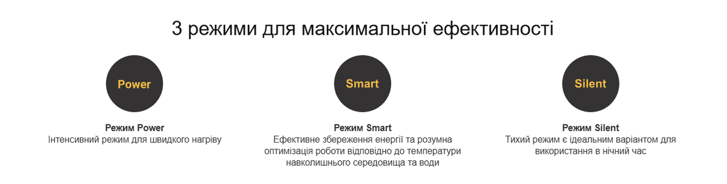 • Режим  роботи «Silent» теплового насоса полягає в спеціальному режимі, при якому насос працює з мінімальним рівнем шуму. У цьому режимі насос працює менш шумно, ніж у звичайному режимі, що особливо важливо в ситуаціях, коли потрібно мінімізувати шум, наприклад, вночі або в неподалік від житлових приміщень. Тихий режим забезпечує комфортне використання теплового насоса, не створюючи зайвого шуму, що особливо цінно в умовах житлових зон або офісних приміщень.