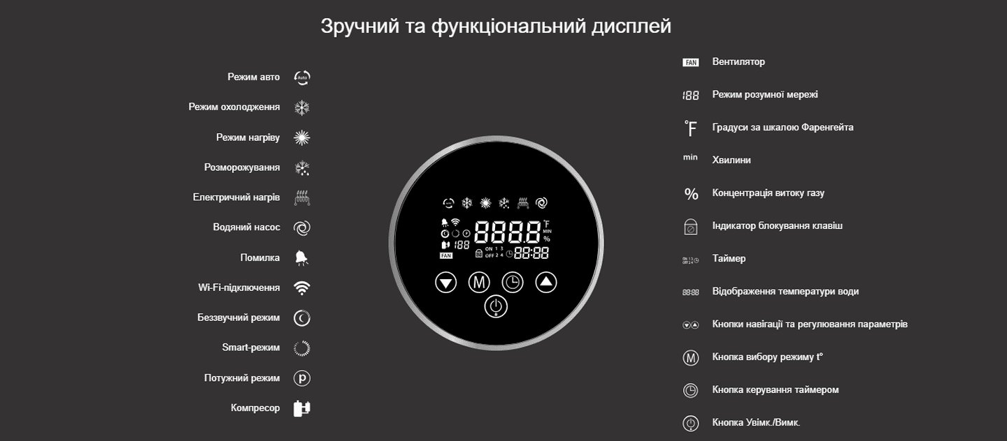 Вбудований контролер дозволяє вибирати режими роботи насоса, включаючи обігрів, охолодження або автоматичне підтримування заданої температури води. Крім того, за допомогою Wi-Fi модуля та додатка Smart Life ви можете керувати насосом з вашого смартфона в будь-який час та з будь-якого місця.
