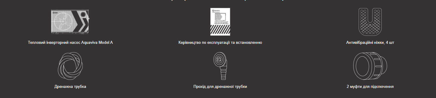 Комплектація: муфта для підключення, дренажний з’єднувач, дренажна труба і шланг. Ці компоненти спрощують установку та підключення теплового насоса, роблячи процес простим та зручним.