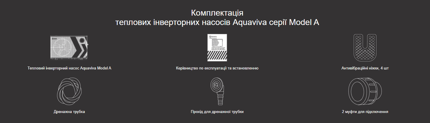 Комплектація: муфта для підключення, дренажний з’єднувач, дренажна труба і шланг. Ці компоненти спрощують установку та підключення теплового насоса, роблячи процес простим та зручним.