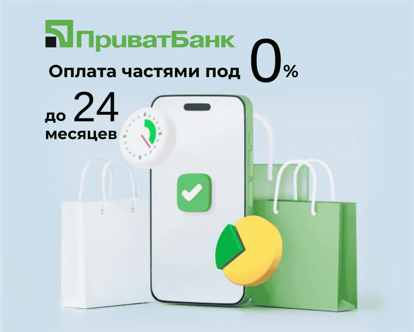 Покупка частями от ПриватбанкаПолучите карту Приватбанк в отделении или в приложении Приват24 и узнайте свой лимит (для получения карты перейдите на сайт privatbank.ua).