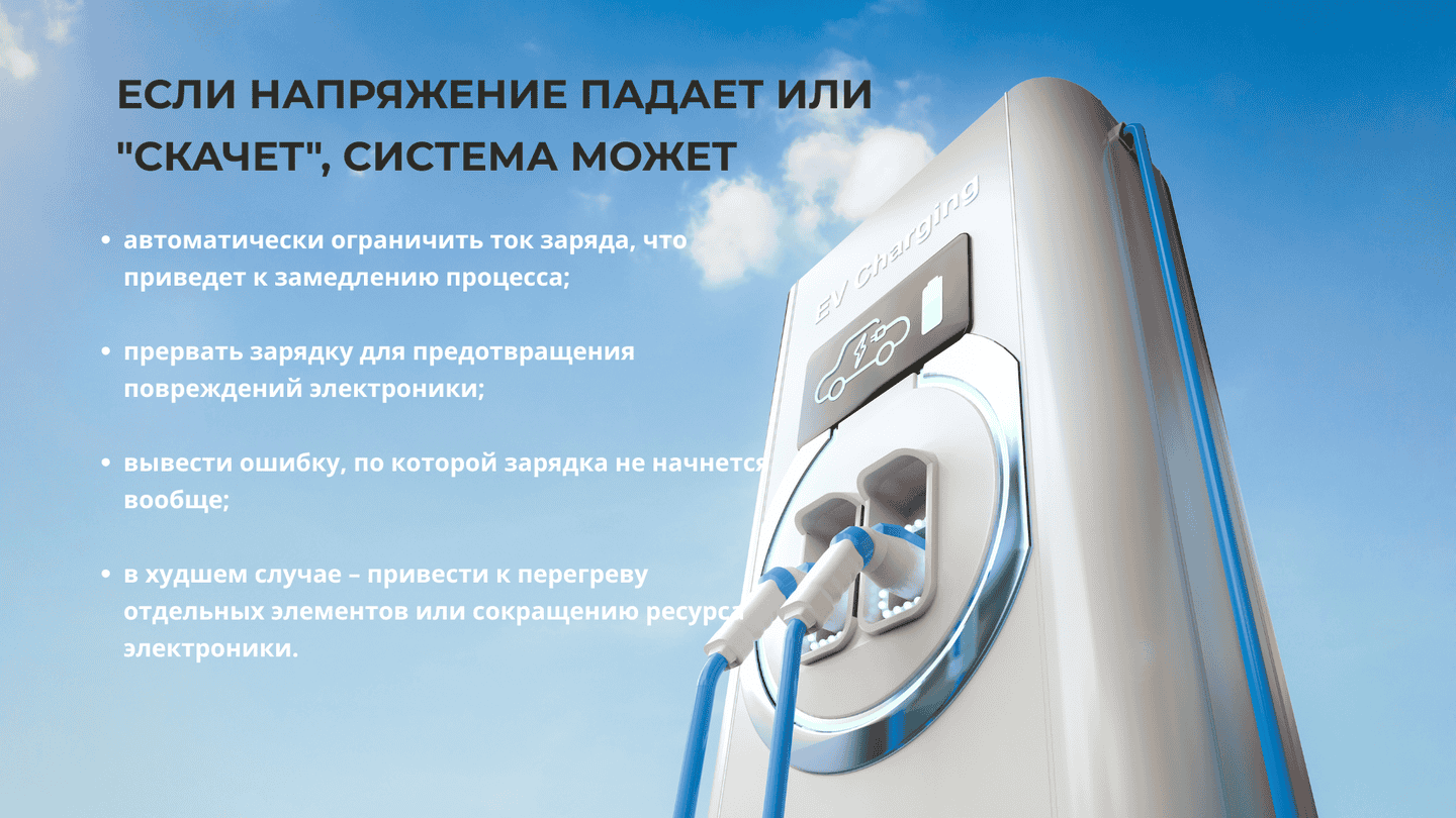 Наихудшая ситуация наблюдается в частном секторе и сельской местности, где напряжение нередко падает до 180–190 В, особенно в вечерние часы, когда общая нагрузка на сеть существенно возрастает. В таких условиях зарядка либо не запускается вовсе, либо идет крайне медленно. И даже если зарядная станция «тянет», аккумулятор и электроника авто работают в режиме повышенной нагрузки, что сказывается на их ресурсе.