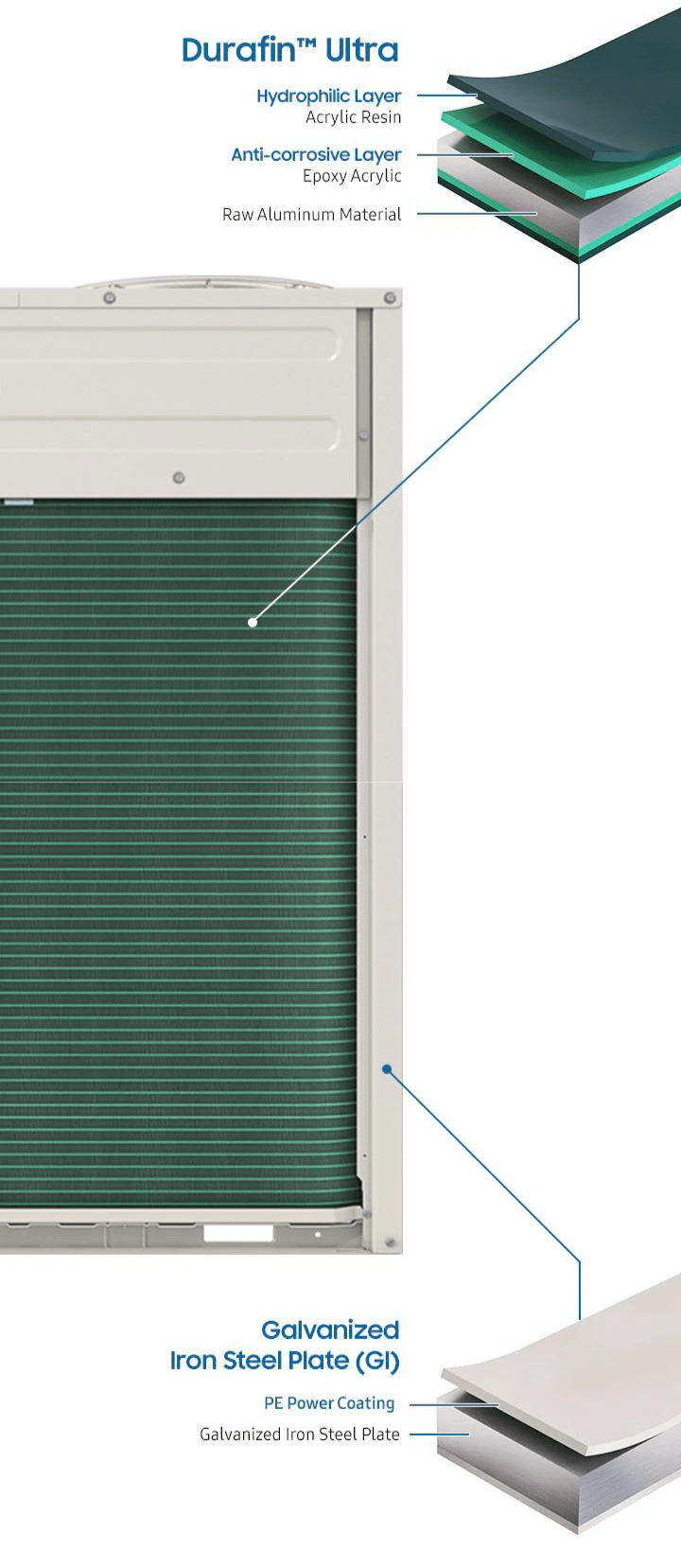 • Технология Durafin™ Ultra обеспечивает гидрофильность поверхности теплообменника. Это означает, что поверхность привлекает влагу и помогает эффективному отводу конденсата, предотвращая его задержку и образование коррозии.