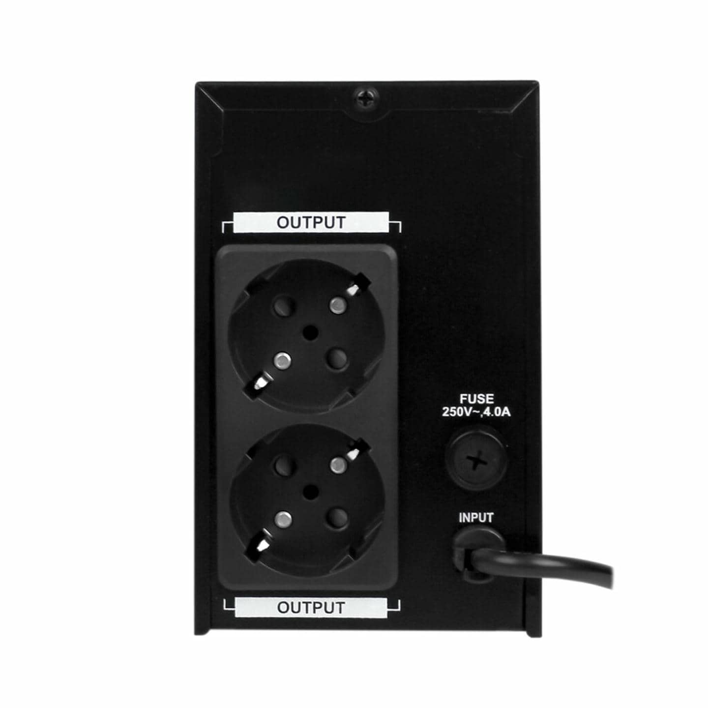 ИБП LPM-825VA подсоединяется к сети питания электрическим током при помощи евровилки. Внешняя сторона корпуса оборудована двумя розетками европейского типа, для подключения электрических приборов.