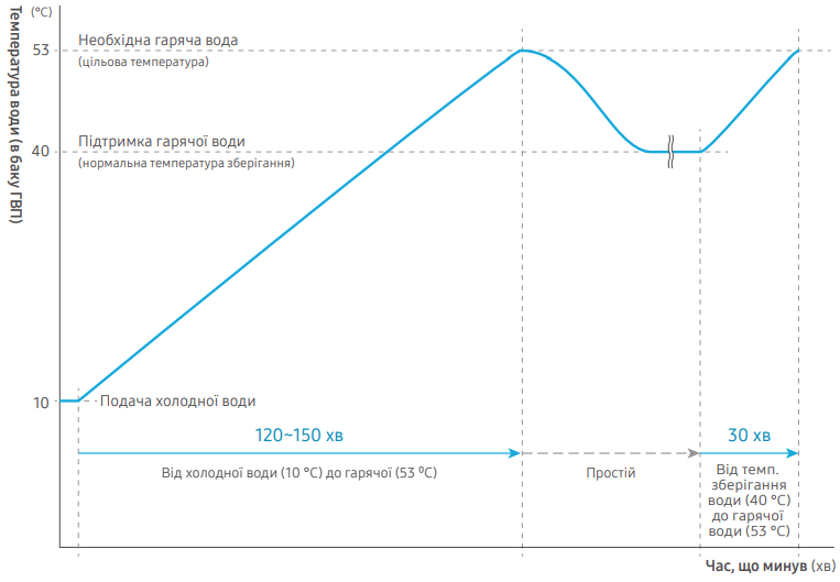 С момента начала нагрева холодной воды проходит 2-2,5 часа, но обычно требуется 30 минут для повторного подогрева воды.