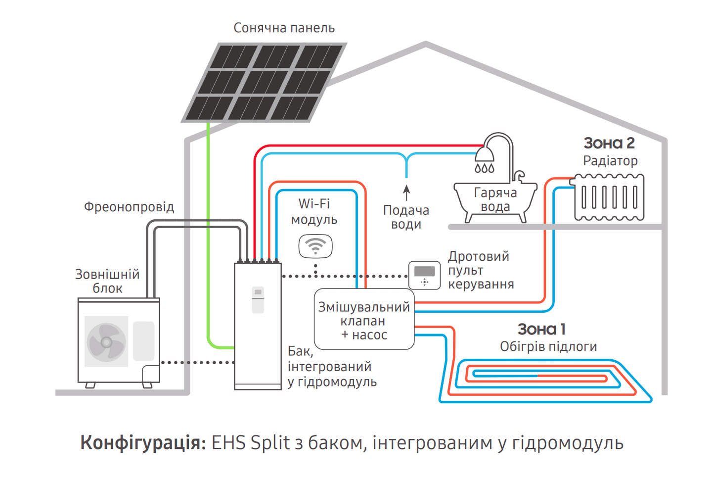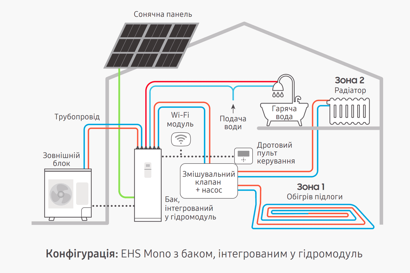 Внешний блок EHS Mono включает гидравлические части, обеспечивающие горячую воду. Для подключения к  внутреннего блока используют водопроводные трубы. Таким образом, его можно легко установить вместо