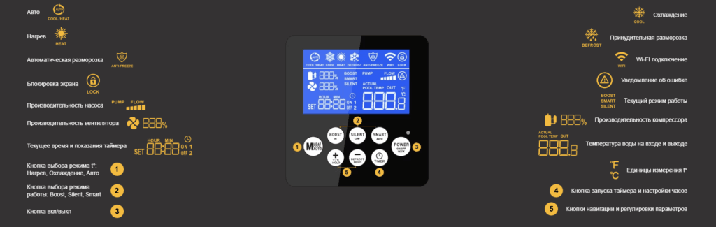 - Выбор режима работы: Контролер позволяет легко переключаться между различными режимами работы, такими как нагрев, охлаждение или автоматическое поддержание температуры, обеспечивая максимальную гибкость в эксплуатации насоса в соответствии с потребностями пользователя.