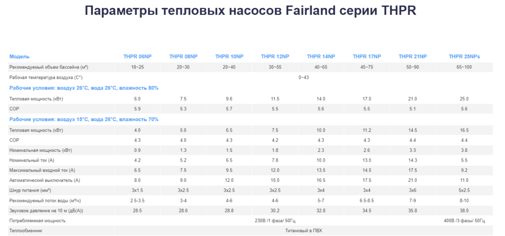 Совместимость с соленой водой. Тепловой насос Fairland THPR12NP может использоваться для бассейнов с соленой водой. Однако, следует помнить, что концентрация соли не должна превышать 30 ppm, поскольку это может привести к коррозии теплообменника.