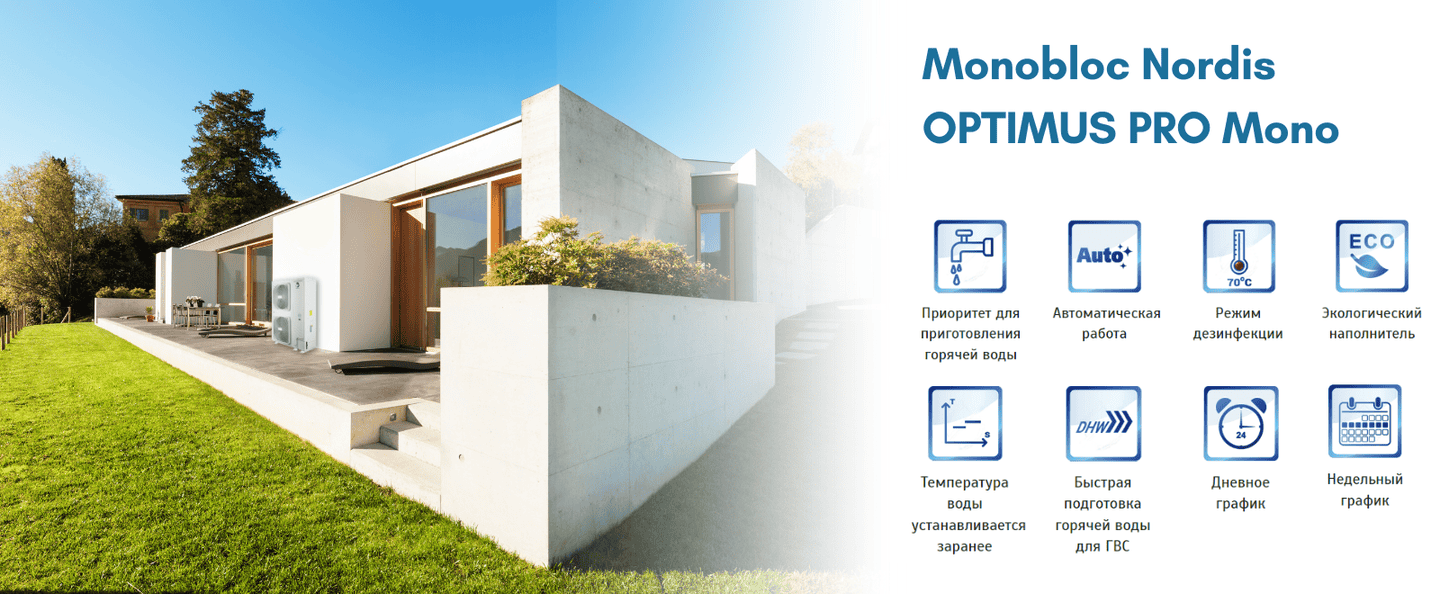 Моноблоки NORDIS Optimus Pro способны работать в режиме отопления даже при наружной температуре до -25 °C. Это обеспечивает стабильное и надежное отопление даже в самые холодные дни зимы, делая эти насосы идеальным выбором для регионов с суровым климатом.