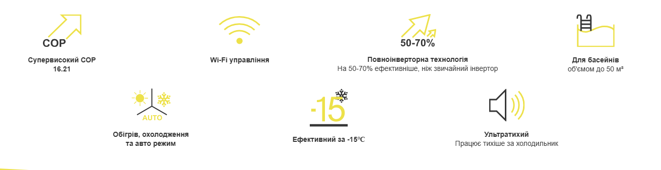 Работает с максимальным коэффициентом производительности: COP 16,21, что обеспечивает эффективность и экономию энергии при обогреве или охлаждении воды в бассейне.