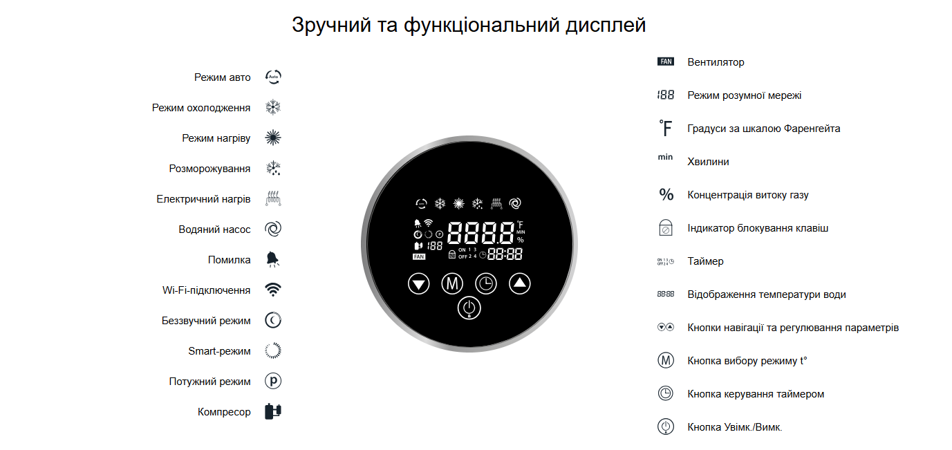 На удобном дисплее отображаются все параметры работы – температура воды, режим нагрева или охлаждения, индикаторы работы компрессора, вентилятора и таймера. Кроме того, насос оснащен системой электробезопасности, защитой от перенапряжения и функцией регулярной стерилизации, предотвращающей развитие бактерий в воде.