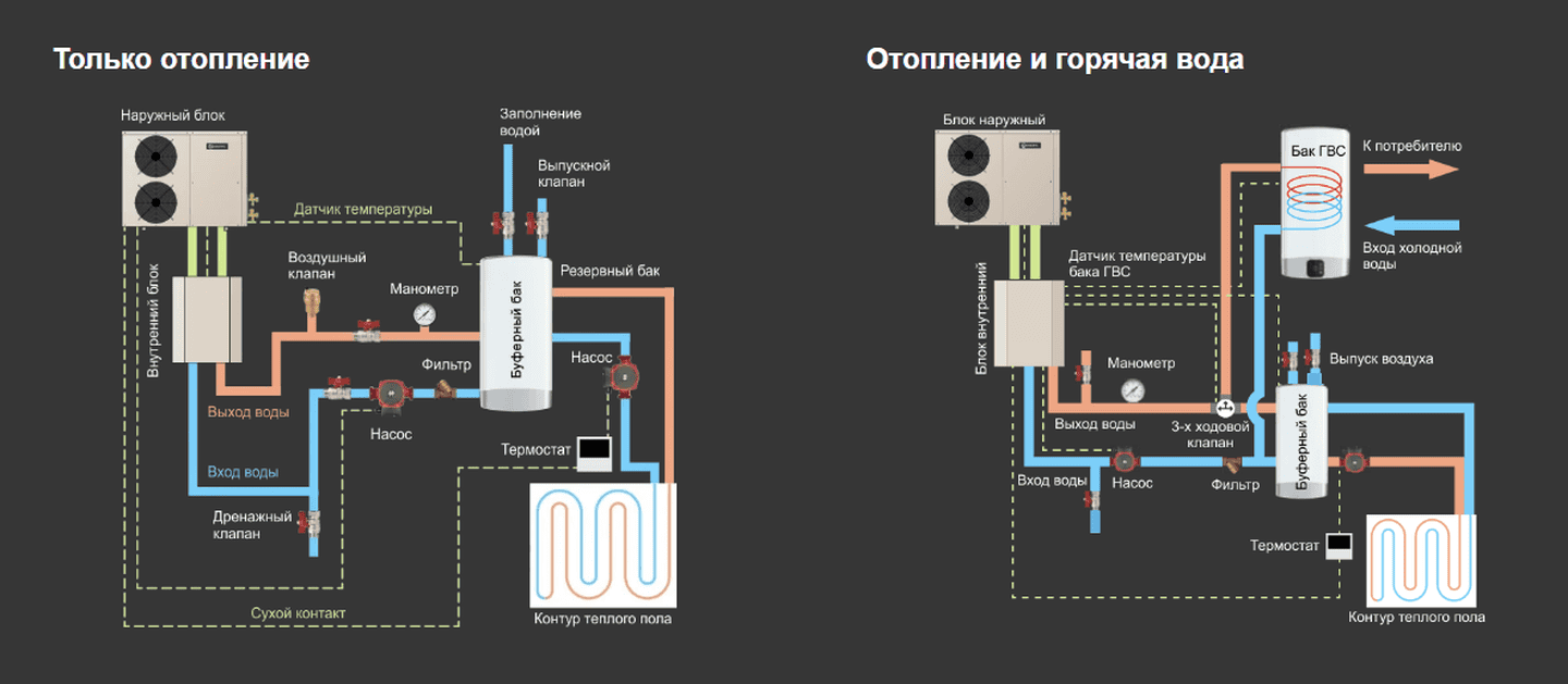 • Высокая производительность: Даже при низких температурах снаружи, система поддерживает эффективное отопление и нагрев воды.