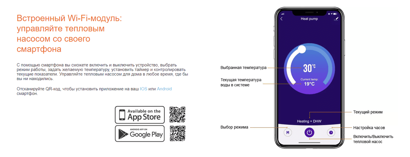 Aquaviva AVH18SPV оснащен Wi-Fi модулем, что позволяет пользователям контролировать работу теплового насоса удаленно через смартфон или планшет. Это включает возможность изменять режимы работы, регулировать температуру, устанавливать таймеры и мониторить текущее состояние системы из любой точки мира.