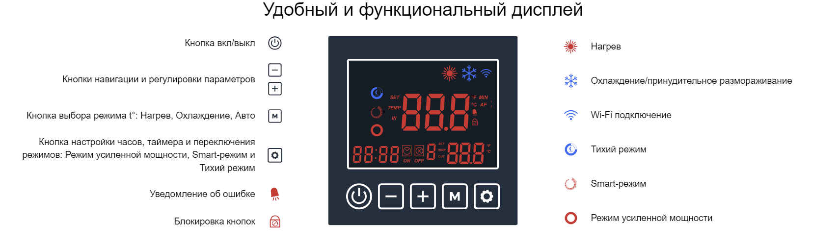 • Режим «Smart» предназначен для обогрева воды в бассейне в диапазоне от 5 до 40°C и охлаждения в диапазоне от 8 до 35°C. Пользователь может установить желаемую температуру, и тепловой насос будет работать на максимальной мощности для быстрого достижения этой температуры. Этот режим особенно полезен в жаркую погоду или в регионах с высокой температурой окружающей среды, когда вода в бассейне может нагреваться до нежелательных уровней. Тепловой насос охлаждает воду, обеспечивая комфортные условия для купания.