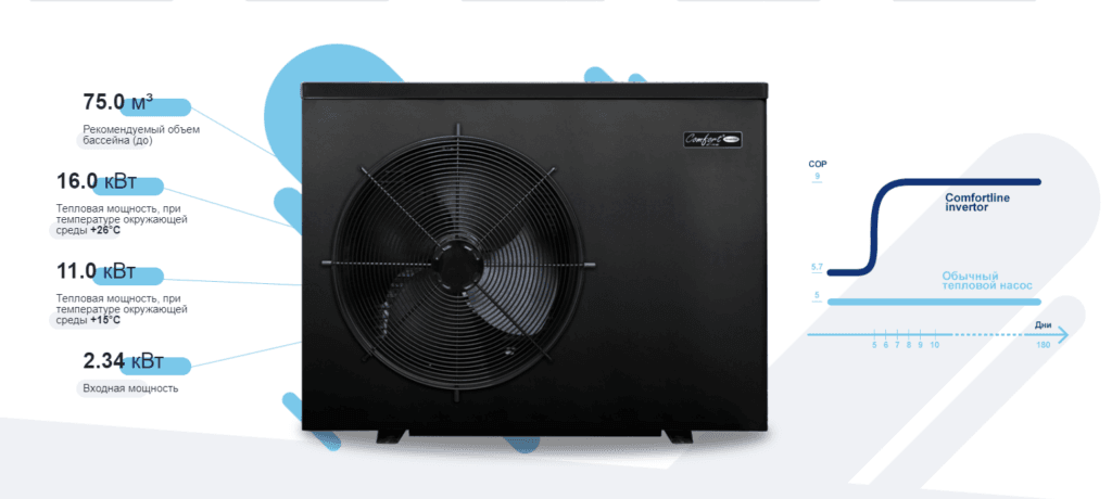 • Работа при низких температурах: Инверторная технология позволяет насосу генерировать тепло даже при низких температурах. Это означает, что устройство может успешно функционировать даже в условиях до 0°С, что делает его универсальным и надежным решением для нагрева воды в бассейнах от +18 до +35°C в любое время года.