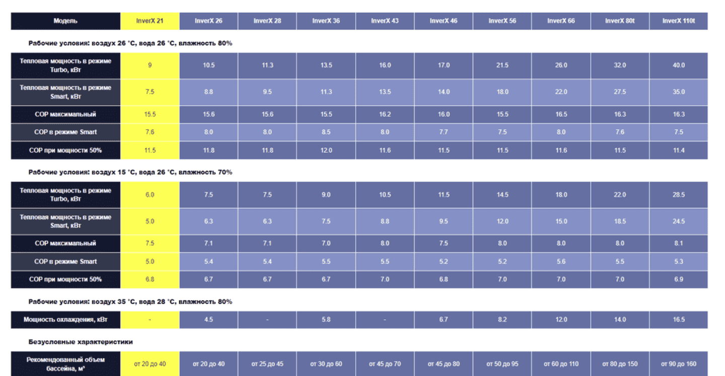 Режим Turbo: Теплопроизводительность: 120%. Этот режим предназначен для быстрого нагрева воды. При активации этого режима насосы серии InverX производят дополнительную энергию на 20%, обеспечивая более быстрый нагрев. При этом насосы остаются на уровне гораздо более тихим, чем обычные инверторные насосы, и имеют более высокий коэффициент производительности (COP).