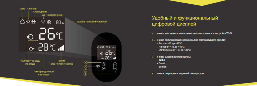 Контроллер с ЖК-дисплеем: обеспечивает эффективную и удобную эксплуатацию. Функция блокировки экрана защищает настройки насоса, обеспечивая безопасность его работы. Контроллер отображает данные о мощности насоса и вентилятора, обеспечивая возможность диагностики проблем. Таймер позволяет контролировать временные параметры работы насоса. Поддержка Wi-Fi позволяет подключить насос к смартфону для уведомлений о проблемах. Контроллер предоставляет информацию о текущем режиме работы насоса и его эффективности, что обеспечивает точный контроль над процессом нагрева или охлаждения воды в бассейне.