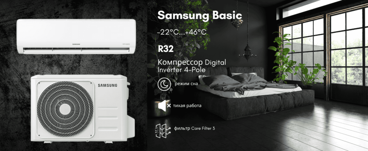 3. Кондиционер Samsung Basic AR24BXHQASINUA 7,1 кВт, до 70 кв.м, фреон R32, инверторный до -22°C