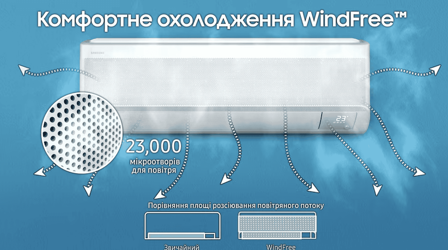 Почувствуйте приятную прохладу без неприятного потока холодного воздуха. Технология WindFree™ равномерно распределяет воздух через 23 000 микроотверстий в передней панели. Воздух движется медленно и мягко, создавая эффект «неподвижного воздуха».