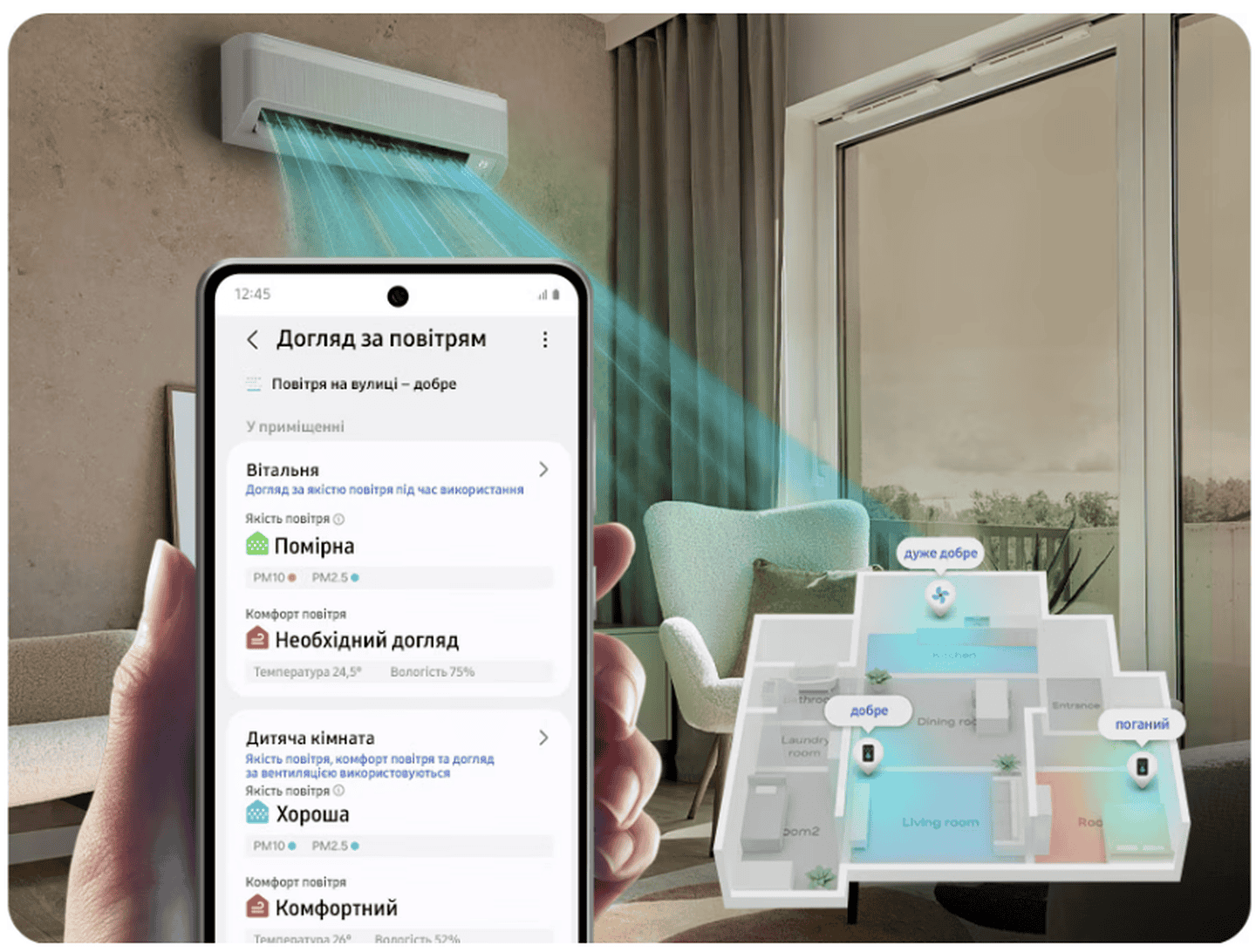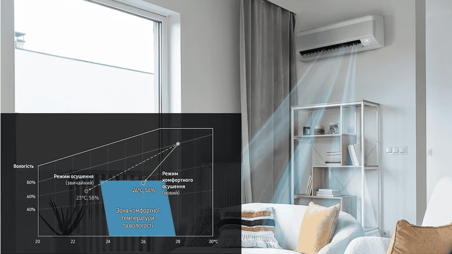 * Данные получены на модели AR50F12C1AH/EU при сравнении обычного режима осушения и режима Comfort Dry в помещении площадью 66 м² при 27°C / 24°C. Энергопотребление измерялось при влажности ниже 60%.