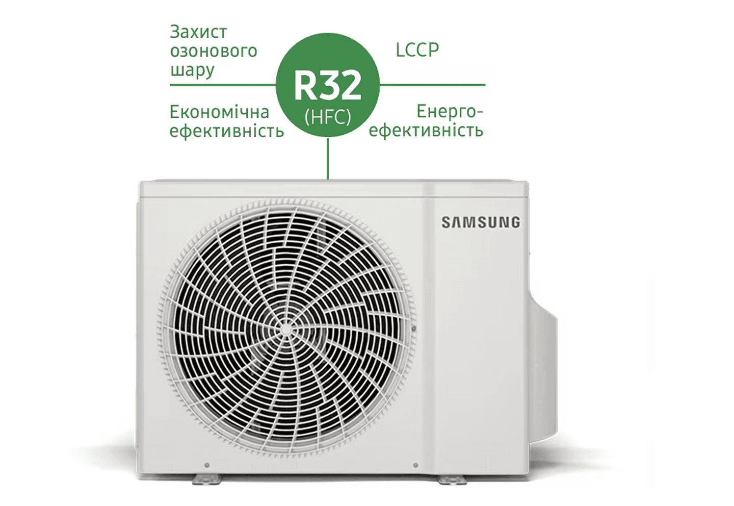 Использование хладагента R32 — более безопасное для окружающей среды решение. Он не разрушает озоновый слой (ODP = 0) и имеет значительно меньшее влияние на глобальное потепление (низкий GWP) по сравнению с R22 и R410A.