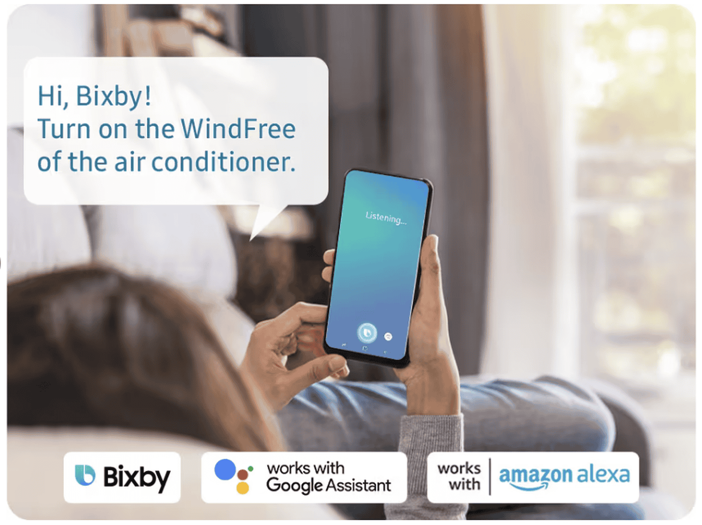 Управляйте кондиционером дистанционно через приложение SmartThings* или голосом с помощью Bixby***, Amazon Alexa**** или Google Assistant*****.
