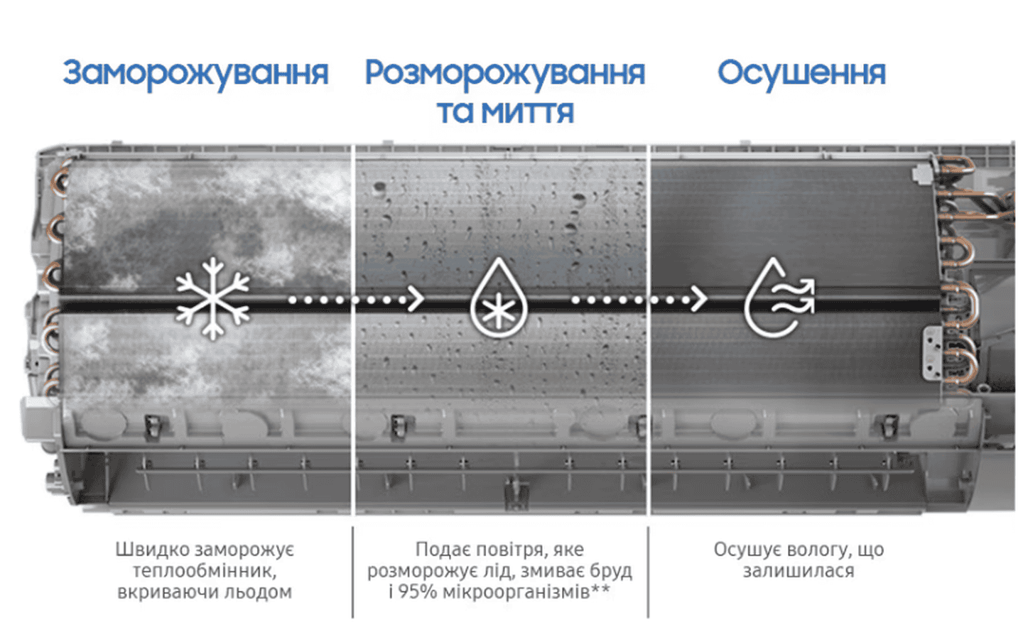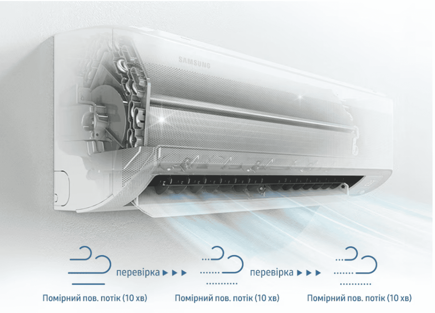 После выключения кондиционера активируется режим самоочистки, который в течение 10-30 минут устраняет остатки влаги из теплообменника, предотвращая появление бактерий и неприятного запаха.