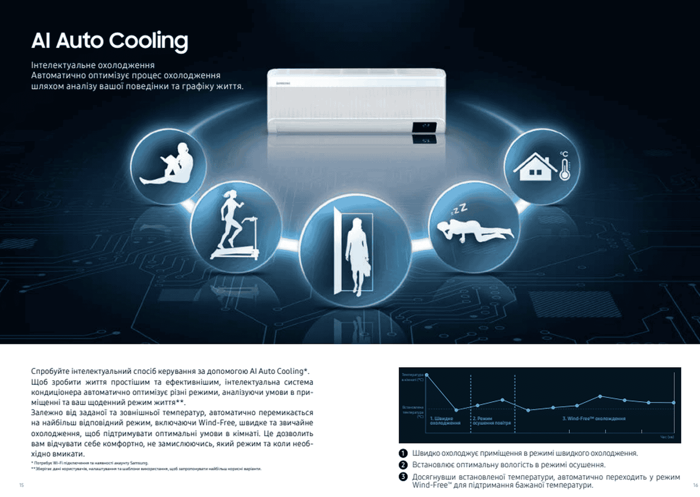 Оптимальные параметры охлаждения и нагрева: Исходя из полученных данных о погодных условиях и текущей температуре внутри помещения, AI Auto Cooling автоматически выбирает наилучшие параметры для кондиционера. Это означает, что система может автоматически перейти в режим быстрого охлаждения при резком повышении наружной температуры или в режим нагрева при понижении температуры. Такой подход позволяет обеспечить постоянное поддержание комфортной температуры без необходимости в постоянном ручном регулировании.